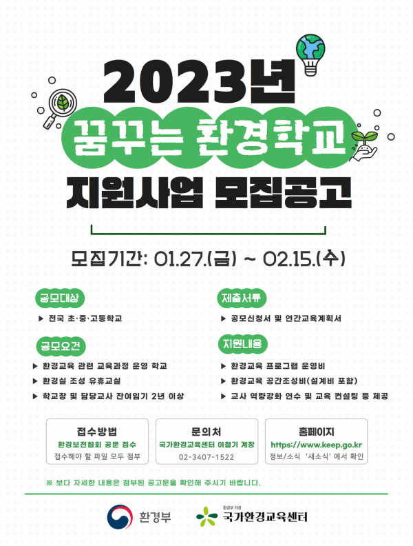 전국 초 중 고등학교를 대상으로 2023년 꿈꾸는 환경학교에 대한 지원사업이 있어 공유합니다.