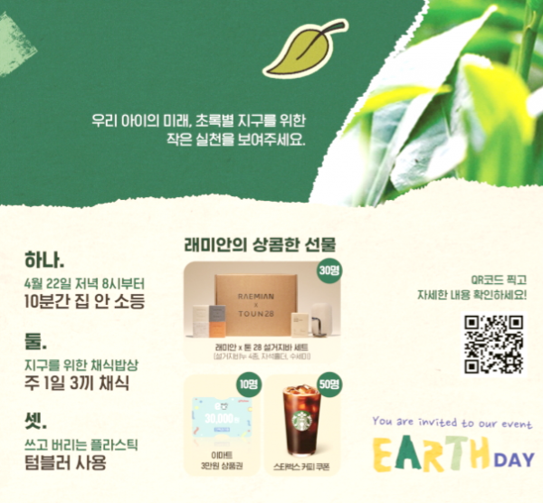 지구의 날을 맞이하여 환경에 대한 생각을 한번 더 해볼 수 있는 기회가 되길 바래봅니다!