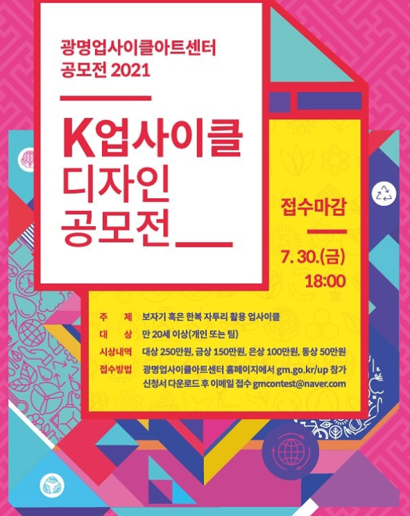 이번 공모전은 업사이클 디자인을 통해 업사이클 문화를 알리고자 기획됐으며, 광명시만의 지역 특화 콘텐츠로 환경과 한국적인 소재를 가지고 디자인된 업사이클의 가치를 알릴 계획입니다.